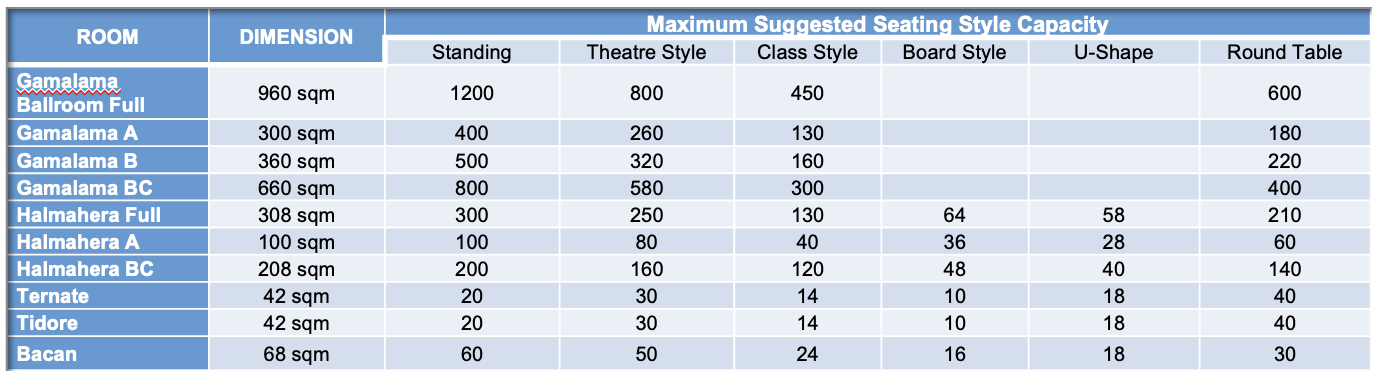 • Standard equipment: LCD screen, whiteboard, flip chart, stationary, microphones (wired and wireless), pen and marker, candies.